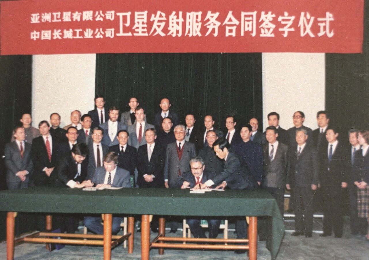 亚洲卫星一号发射服务合同签字仪式,长城公司乌可力(前排右二)作为中方代表签约