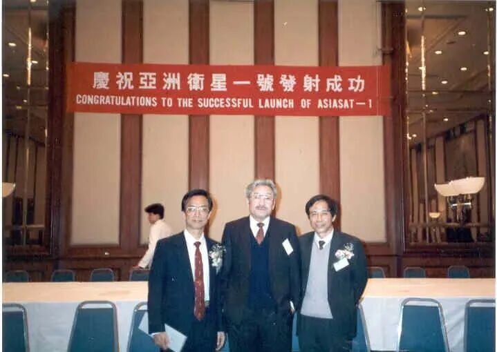 亚洲卫星一号成功发射后,陈寿椿(左)、乌可力(中)等合影留念