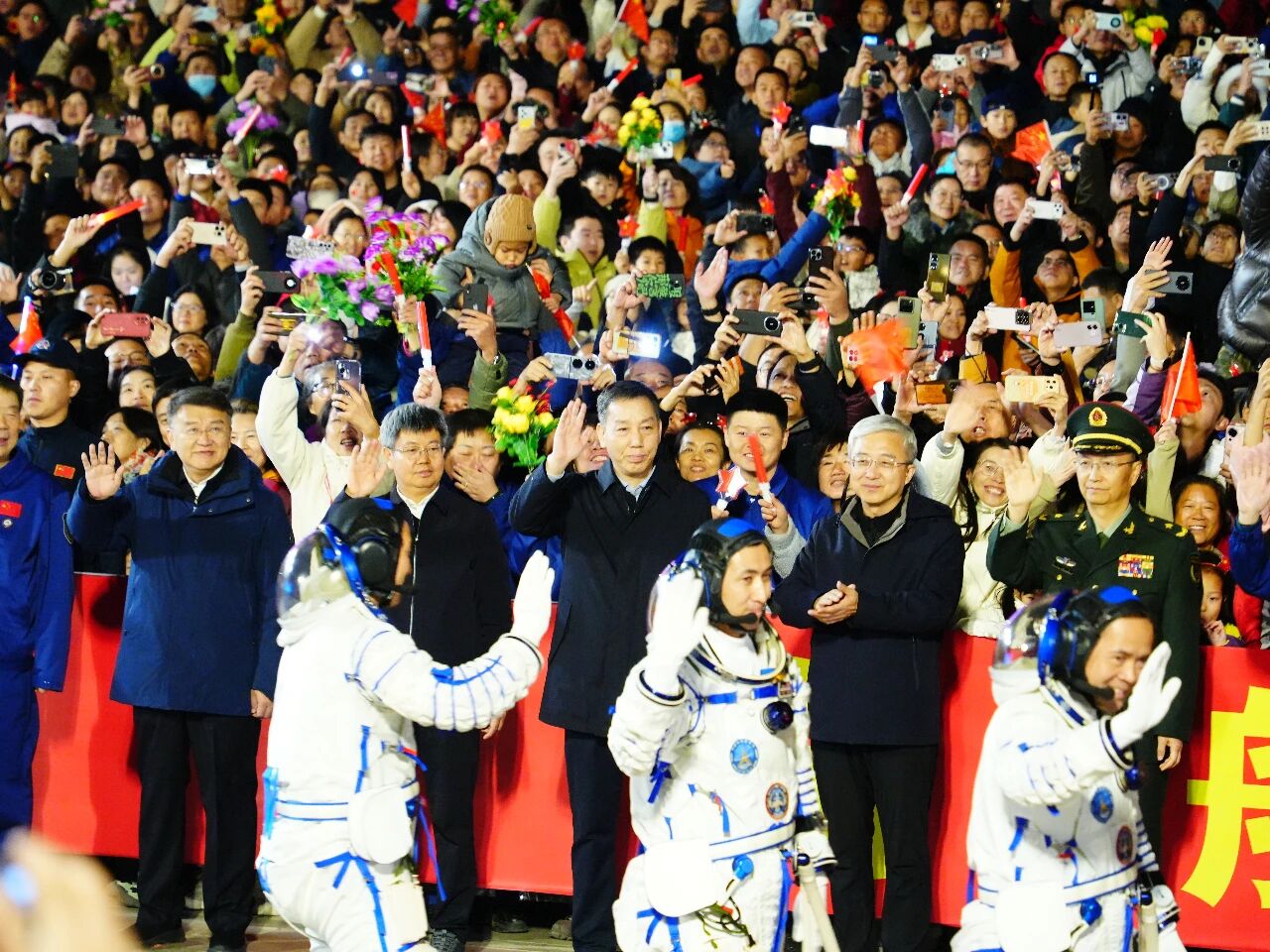 空间站应用与发展阶段飞行任务总指挥部有关成员以及航天科技人员、各族群众代表在现场为航天员乘组壮行。
